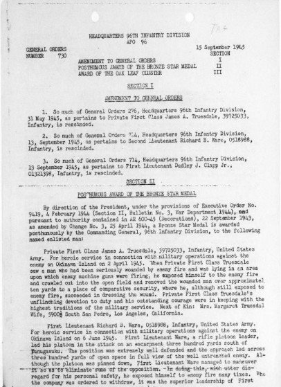 “Private First Class James A. Truesdale, 39725033, Infantry, United States Army. For heroic service in connection with military operations against the enemy on Okinawa Island on 2 April 1945. When Private First Class Truesdale saw a man who had been seriously wounded by enemy fire and was lying in an area upon which enemy machine guns were firing, he exposed himself to the enemy fire and crawled out into the open field and removed the wounded man over approximately ten yards to a place of comparative security, where he, although still exposed to enemy fire, succeeded in dressing the wound. Private First Class Truesdale’s unflinching devotion to duty and his outstanding courage were in keeping with the highest traditions of the military service.”