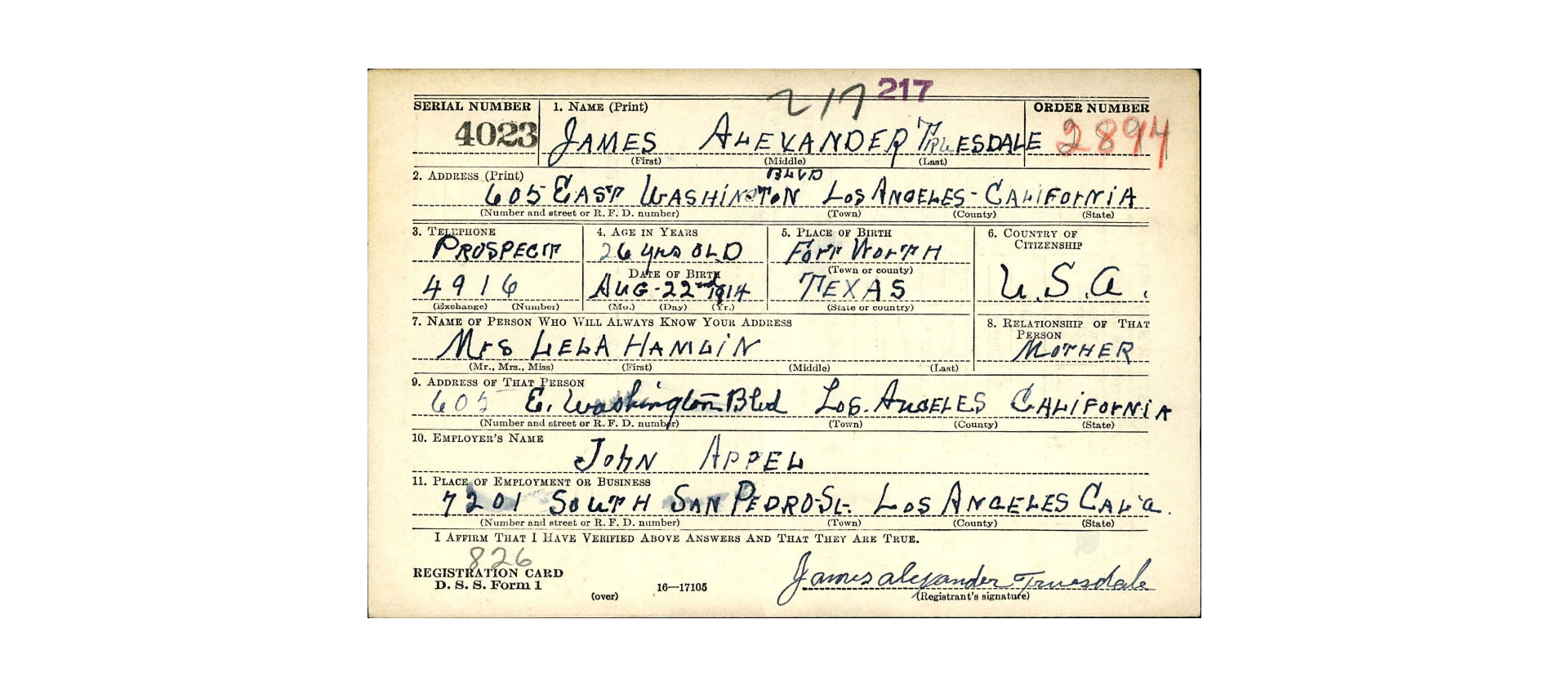 James Alexander Truesdale was born on August 29, 1914, in Fort Worth, Texas. Prior to World War II, he lived in Los Angeles, California, where he worked and built a family life.