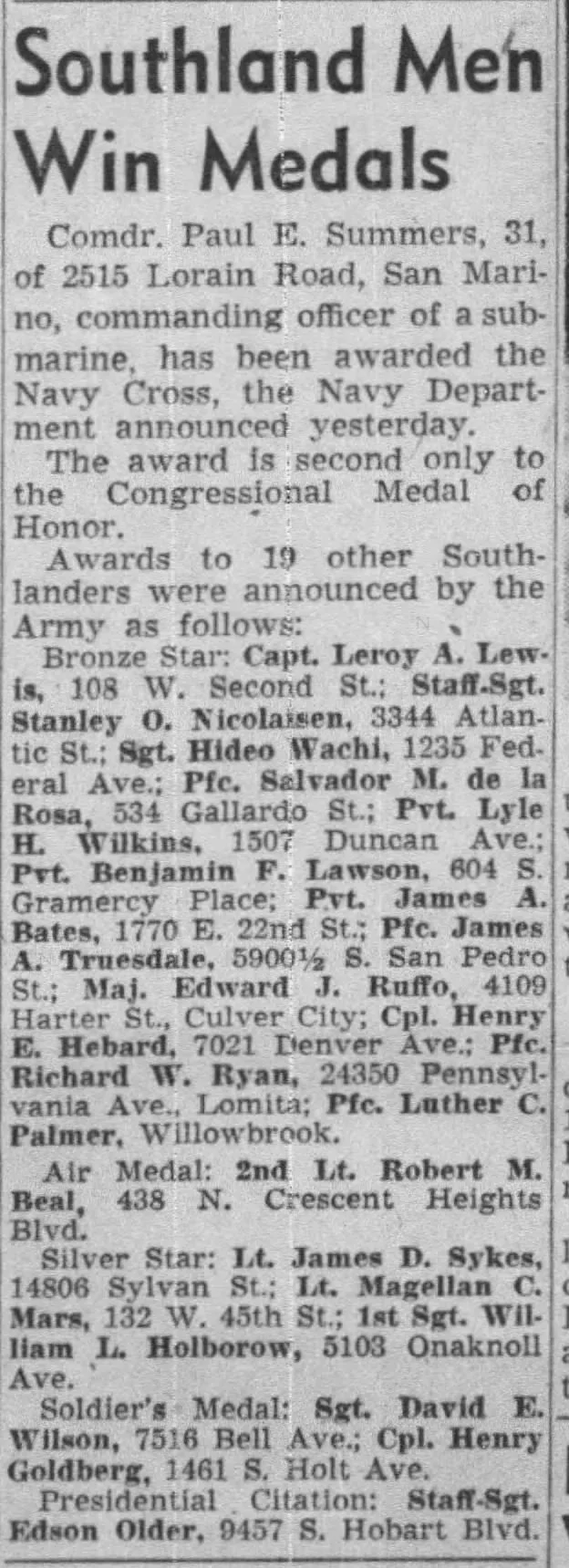 Los Angeles Times anouncement of Bronze Star Citation
