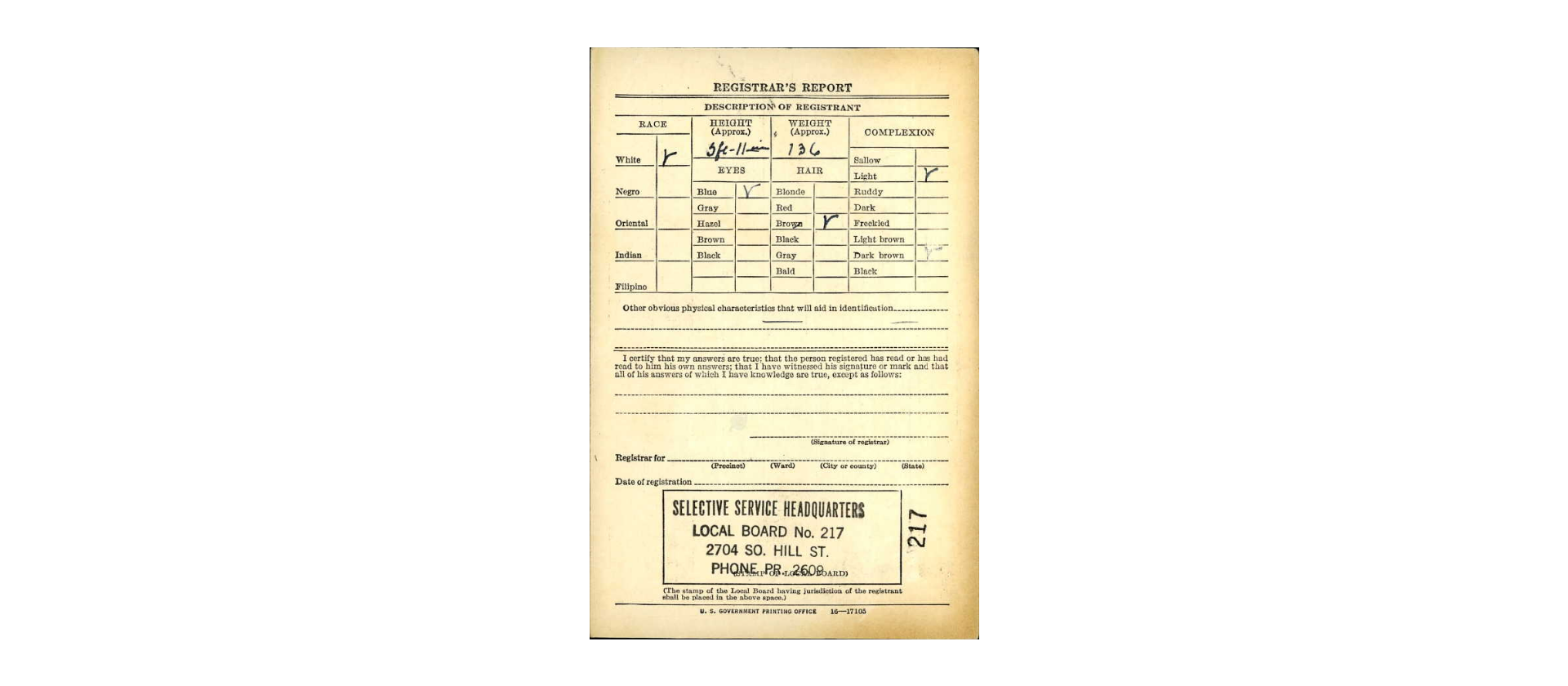 Draft registration records show he resided at 605 East Washington Boulevard and was employed at 7201 South San Pedro Street. He was married to Margaret Truesdale, and together they had a son, Larry.